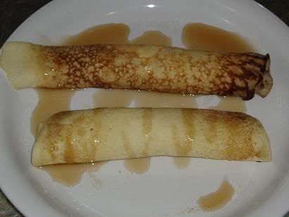 Whisk ingredients together thoroughly (or throw all ingredients into a blender) and cook both sides on a griddle until golden in color. Lightly coat one side with butter and sugar, then roll up the French pancake.